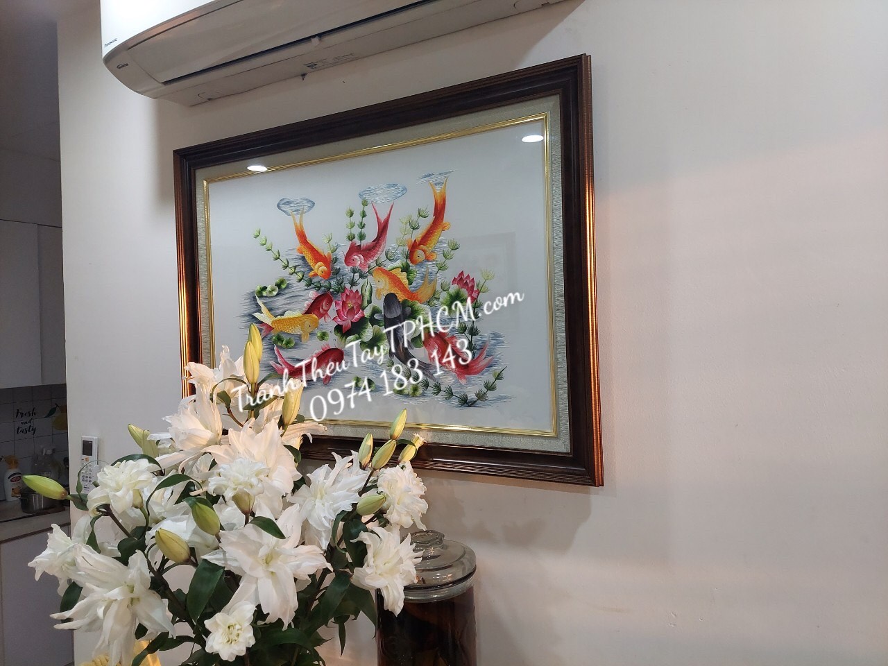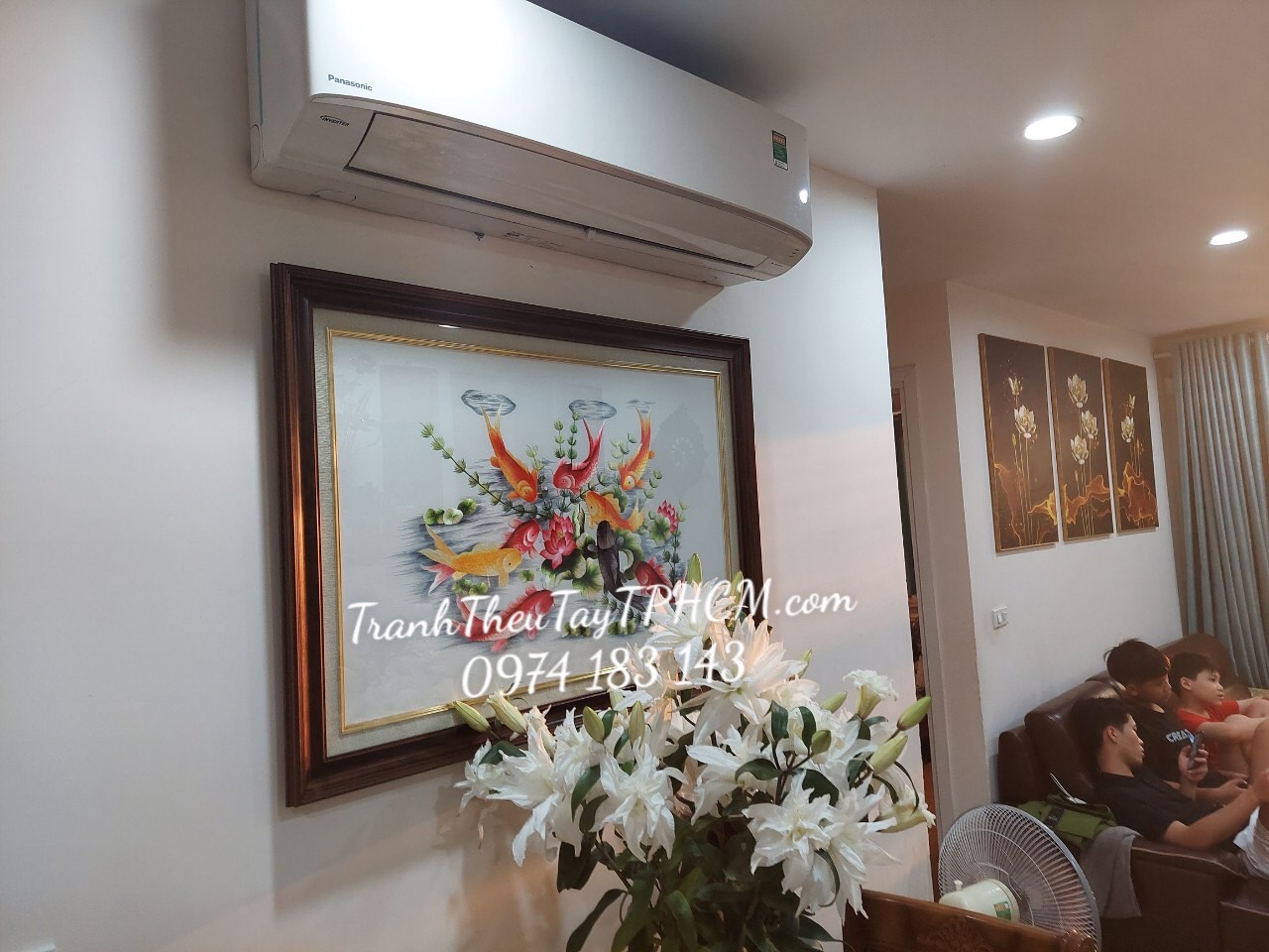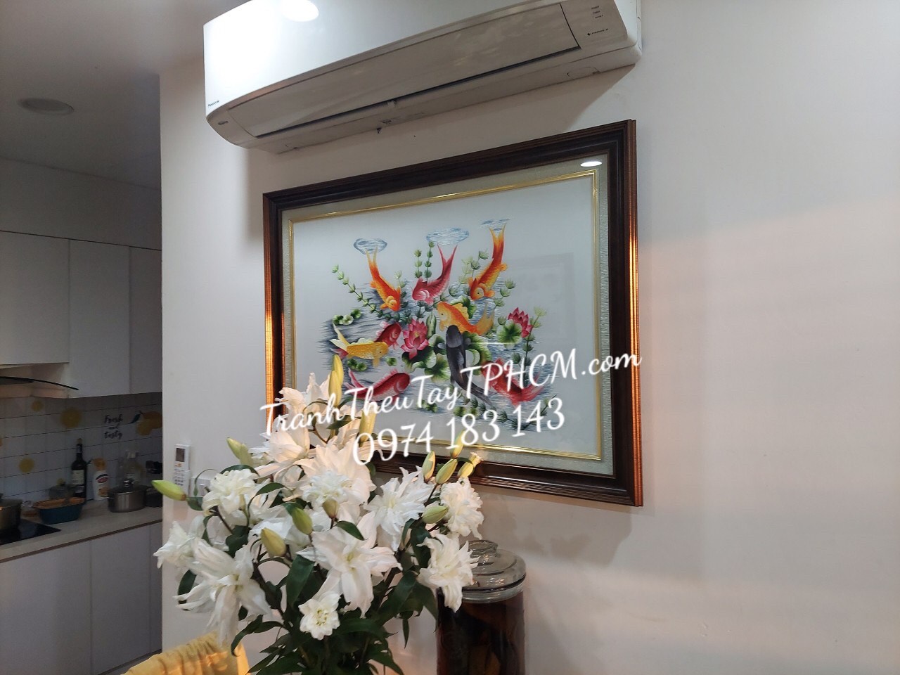 Tranh thêu cá chép hoa sen treo tại nhà anh Hậu ở Hà Nội