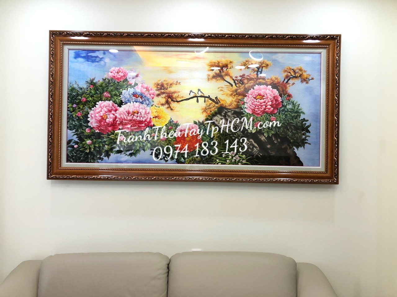 Tác phẩm tranh thêu hoa mẫu đơn được thêu theo yêu cầu của anh Tuấn. Đây là món quà anh dành tặng chị gái mình nhân dịp nhà mới