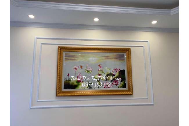 Tranh thêu hoa sen được chị Hạnh ở Ba Đình chọn treo ở phòng khách