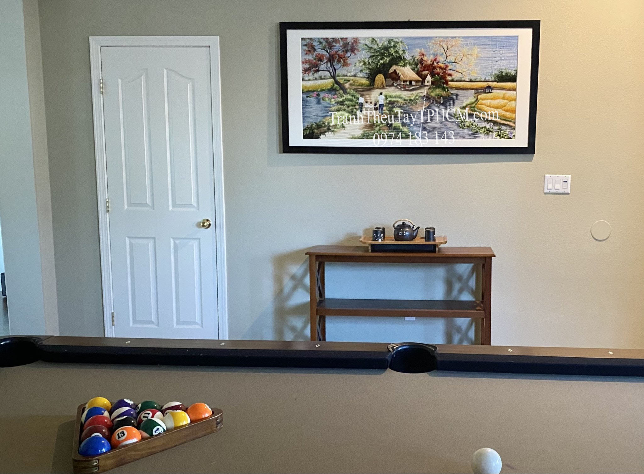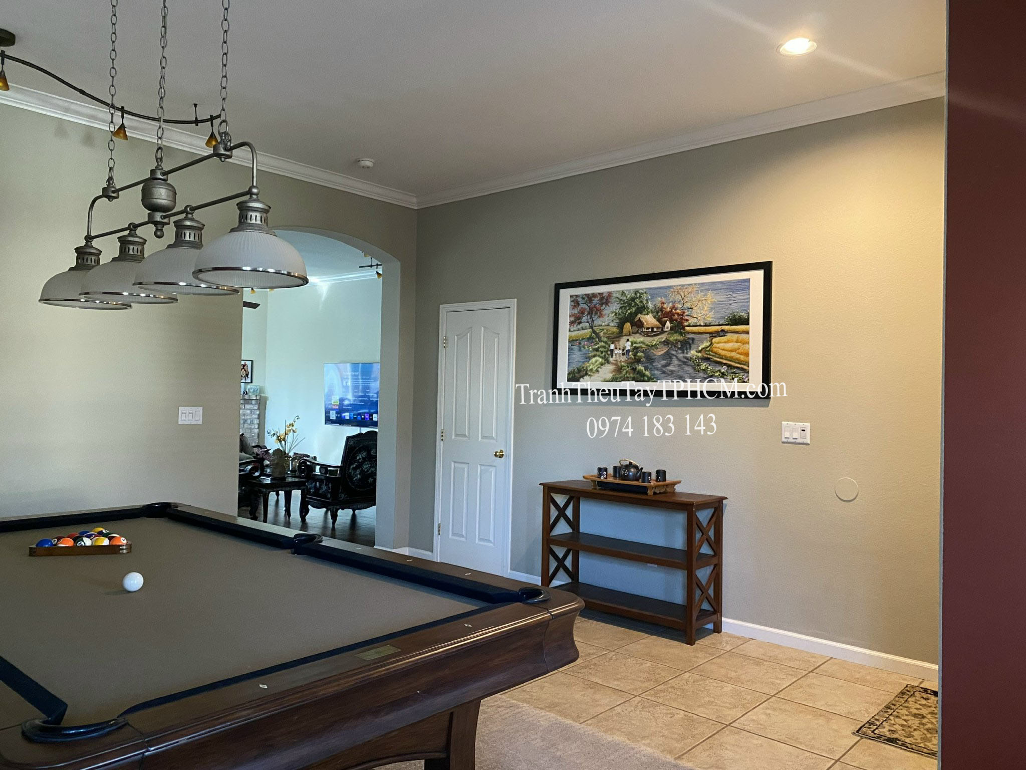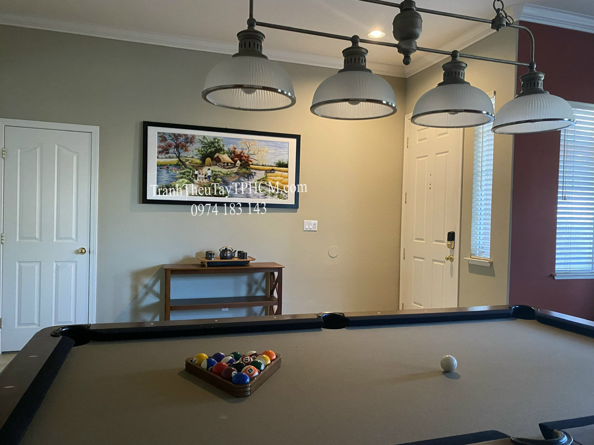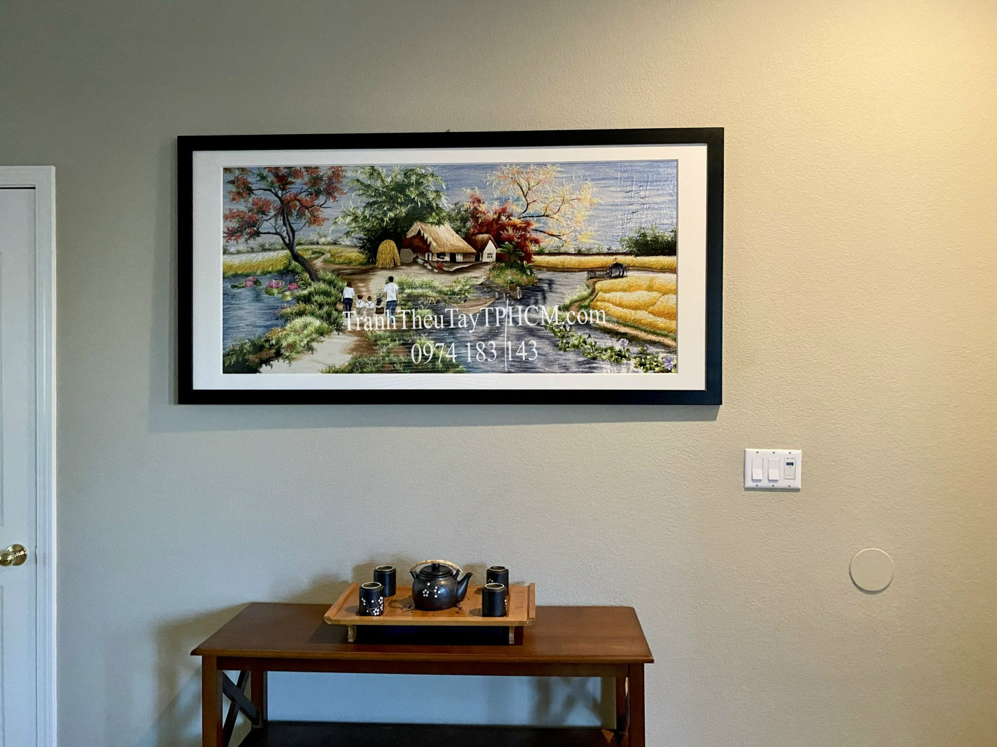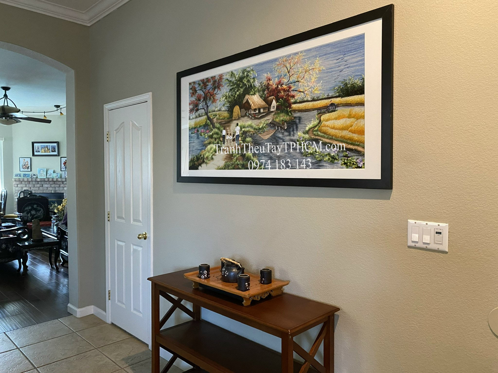 Tác phẩm tranh thêu làng quê được treo tại nhà chị Phương ở Mỹ. Đây là tác phẩm được thiết kế và thêu theo yêu cầu riêng của chị