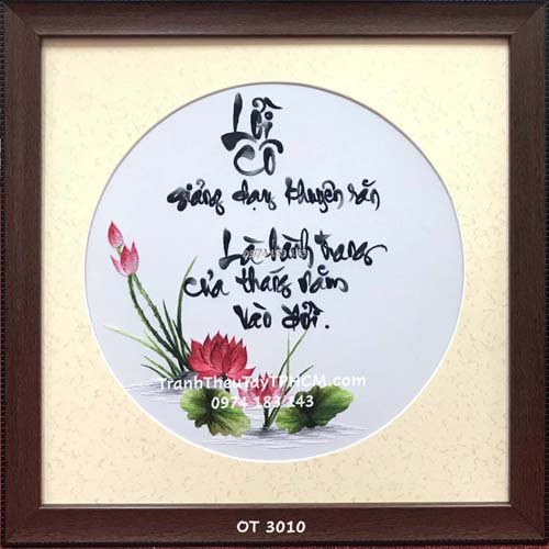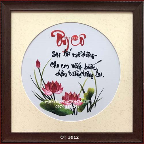 Những bức tranh thêu dành tặng cô giáo thường mang hình ảnh thanh tao, nhẹ nhàng như hoa sen, hoa mẫu đơn hay cảnh cô và trò. Mỗi đường thêu tỉ mỉ đều phản ánh sự trân trọng, lòng biết ơn sâu sắc từ người tặng đến người nhận. Đặc biệt, với những bức tranh thêu chữ như “Tri ân”, “Ơn thầy”, “Ơn cô”, từng nét chữ cũng là lời nhắn gửi chân thành, bày tỏ niềm tôn kính và lòng biết ơn đối với cô giáo – người đã luôn tận tụy trên hành trình truyền dạy tri thức.