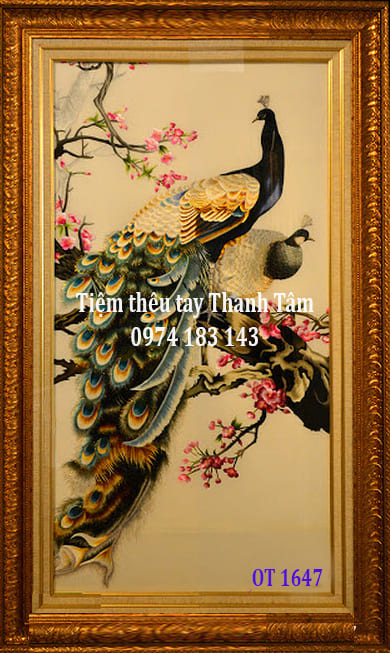 Tranh thêu chim công thể hiện sức mạnh vô tận của trái đất, của thiên nhiên biểu tượng cho sức mạnh cơ hội mới. Treo một bức tranh chim công hay một chiếc bình cắm lông công trang trí huy hoàng là biện pháp xua đi luồng khi xấu mang lại vượng khí cho văn phòng lại đẹp về mặt thẩm mỹ.