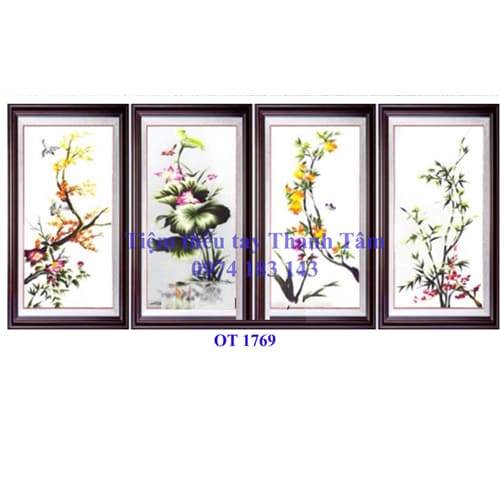 Tranh thêu tứ quý được thêu bằng chỉ tơ trên nền vải lụa, thêu 100% bằng tay bởi nghệ nhân giỏi và kinh nghiệm